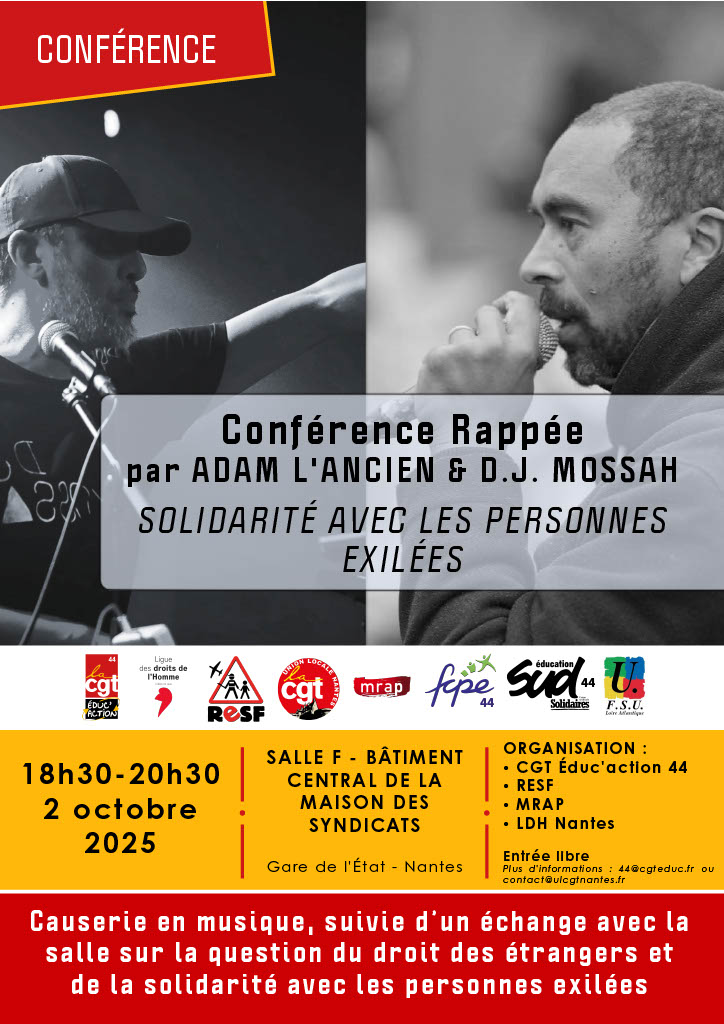 Ils vous proposent une conférence rappée pour présenter les liens entre rap et engagement politique sur le thème des « aventuriers du XXIème siècle » qu’on appelle aussi les « migrants ». Découverte de clips, comparaison de situations nationales ou régionales, analyse de lyrics, rap en live de morceaux originaux, finger-drumming et échange avec la salle ponctueront cette causerie musicale. Avec pour ambition d’amplifier les dynamiques de solidarité avec et par les personnes exilées en Loire Atlantique.